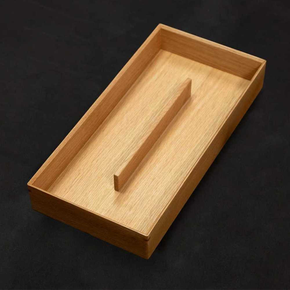 جعبه چوبی با تقسیم‌بندی داخلی به دو بخش که فضای کشو را به‌طور هوشمندانه تفکیک کرده و امکان نظم‌دهی بهینه‌تری را فراهم می‌آورد.