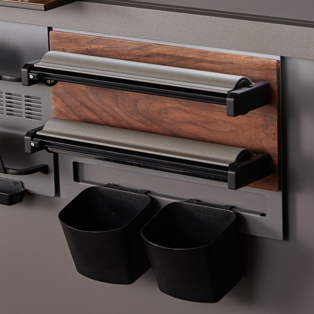جا رولی Basel، محل مناسبی برای نگهداری انواع فویل و نایلون است که نظم و دسترسی آسان را در آشپزخانه ممکن میسازد. تیغههای تعبیه شده با جهتگیری به داخل، ایمنی را در استفاده افزایش میدهند و دو ظرف کوچک کنار آن، فضای اضافه برای نگهداری ابزار نظافت و وسایل کوچک فراهم میکند.