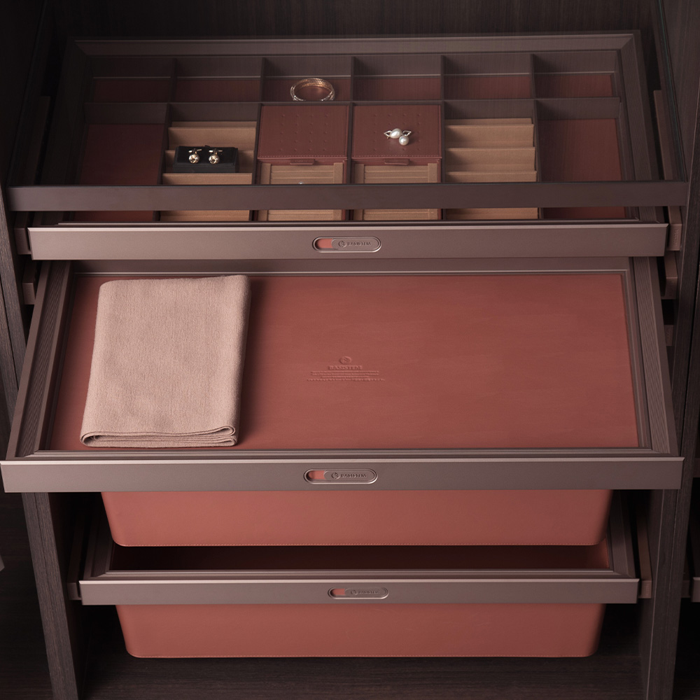 سری BRUGG بر پایه زیباییشناسی ناب، مواد اصیل و استفاده هوشمندانه از رنگها و بافتها خلق شده است؛ جایی که فلز، چرم و طراحی خالص کنار هم فضایی گرم، آرام و کاملاً متمایز ایجاد میکنند. پنل جلویی فلزی هماهنگ با رنگ BRUGG و قاب داخلی فلزی با اتصال دقیق ۴۵ درجه، کیفیت فوقالعاده ساخت و تسلط طراحان بر جزئیات را آشکار میکند. طبقه کشویی این سری، یک سینی کمعمق با کف چرمی است که برای نگهداری لباسهای سبک,از ابریشم تا کتان و پنبه خالص,بهطور خاص طراحی شده. عمق محدود و طراحی تخت این کشو باعث میشود لباسها بدون فشار و تاخوردگی نگهداری شوند و چیدمان آنها همیشه در یک نگاه در دسترس باشد.