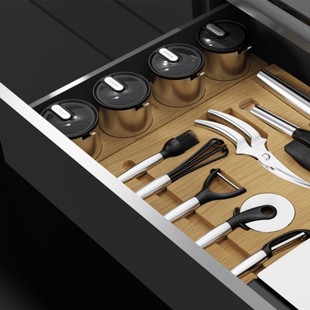 سری Chur با رویکرد ماژولار و طراحی پیشگامانه خود، تمام نیازهای نظمدهی در آشپزخانه را به بهترین شکل پاسخ میدهد. جعبه نظمدهنده ادویه با بدنه چوبی از بلوط سفید آمریکای شمالی و چهار ظرف استیل مقاوم، فضای مناسبی برای نگهداری و مرتب کردن ادویهها فراهم میکند. این طراحی ظریف و کاربردی به کاربران امکان میدهد تا با دسترسی آسان، آشپزی را با لذت و آرامش بیشتری تجربه کنند.این جعبه نظمدهنده قابل سفارش در دو عمق مختلف است و به آسانی با انواع کشوها و ریلها هماهنگ میشود.