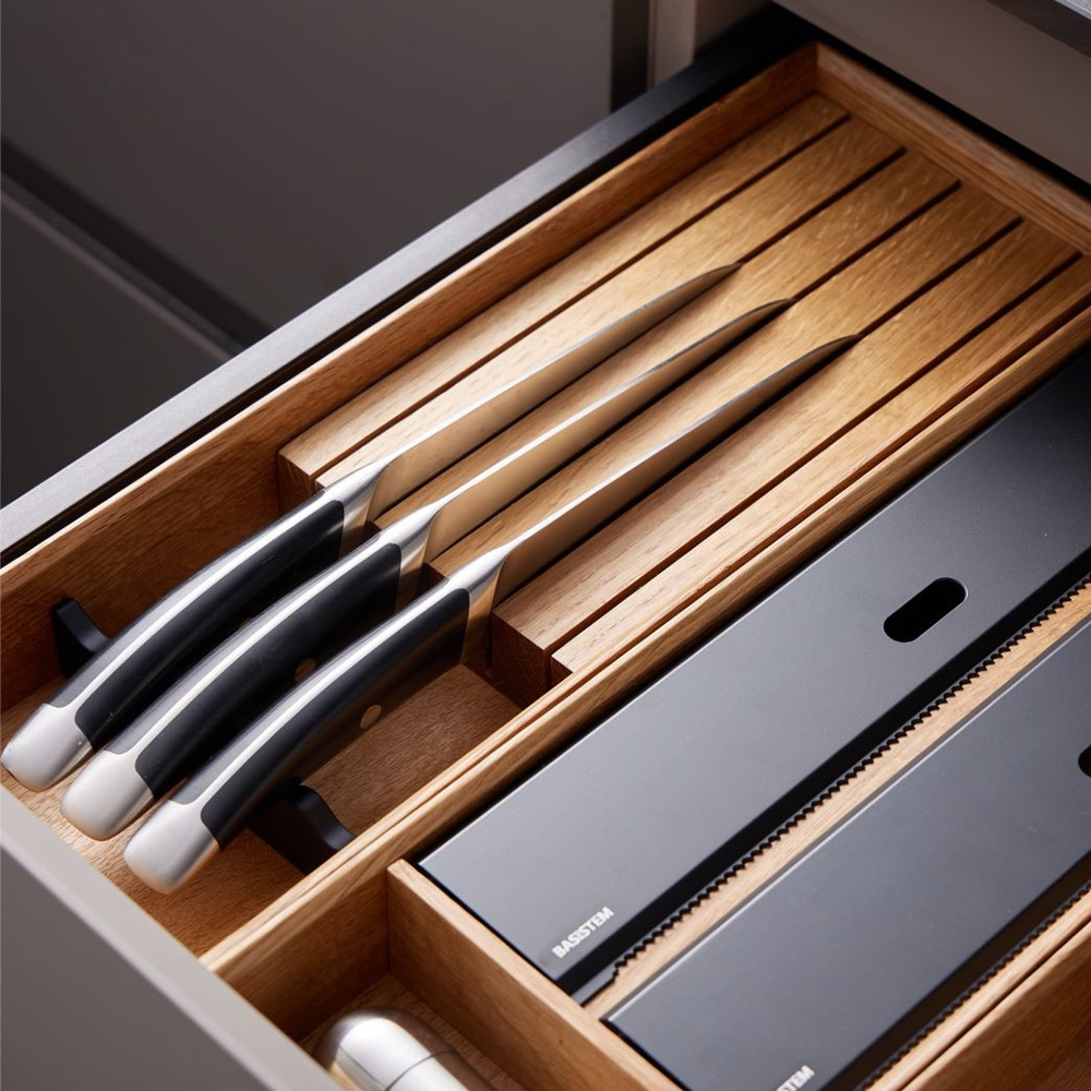 سری Chur نمادی از نظم پیشرفته در آشپزخانههای حرفهای است و جعبه نظمدهنده چاقو بخشی جداییناپذیر از این سیستم است. طراحی دقیق این جعبه، با قطعه چوبی داخلی، هر چاقو را در جای خود نگه میدارد و از تماس مستقیم و آسیب به تیغهها جلوگیری میکند. این نظمدهنده، ایمنی و زیبایی را همزمان به کشوی شما میآورد.این محصول به صورت ماژولار طراحی شده و با سایر نظمدهندههای سری Chur قابل ترکیب است.