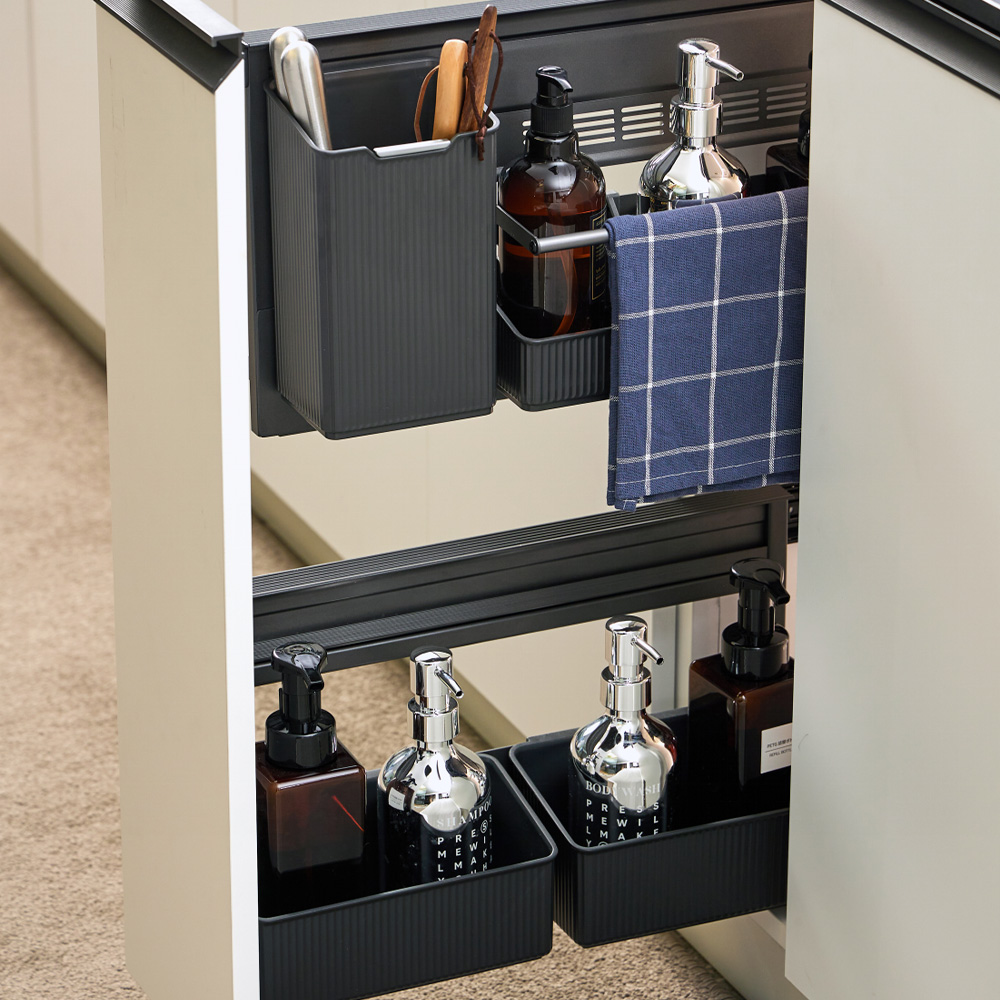 این محصول با طراحی دو بخشی، فضای باریک کابینت را به بهترین شکل به نظم و کاربرد تبدیل میکند. بخش پایینی به درب یونیت متصل شده و امکان ذخیره وسایل بلند را دارد. بخش بالایی شامل سبدی با دیوایدر و جعبه ابزار است که حتی جای دستمال نظافت را نیز در نظر گرفته است. ریلهای Hettich آلمانی، حرکتی نرم و آرامبند ایجاد میکنند که تجربه کاربری راحت و بیدردسری را تضمین میکند. متریال با کیفیت محصول، ضد خش و ضد آب بوده و تمیزکاری را آسان میکند. ترکیب این دو بخش، استفاده کامل از فضای محدود را ممکن میسازد و آشپزخانهای منظم و زیبا به شما هدیه میدهد.