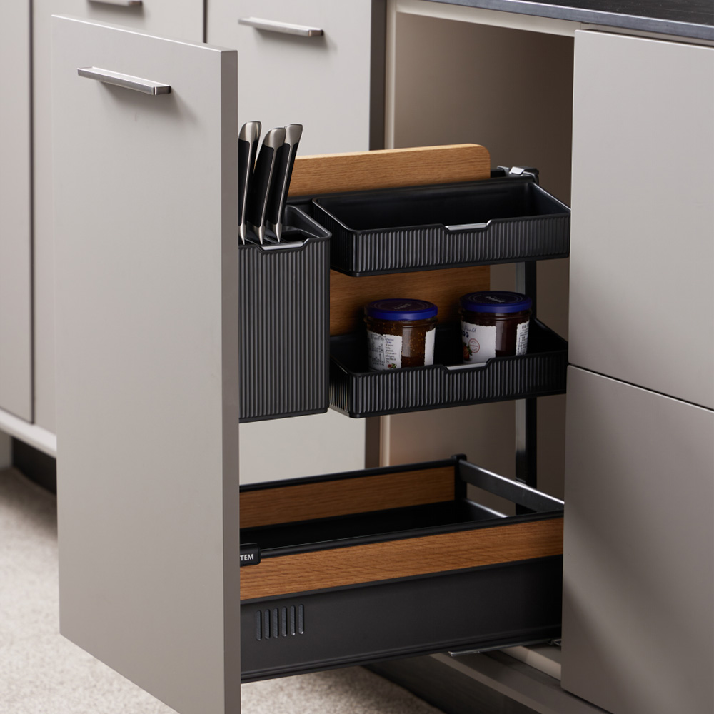 این سبد کشویی چندمنظوره با تمرکز بر نظم‌دهی دقیق طراحی شده و برای نگهداری انواع ظروف چاشنی و بطری‌ها با ارتفاع‌های متفاوت ایده‌آل است. چیدمان هوشمند سبدها در طبقه بالا، فضاهایی با ارتفاع‌های متنوع ایجاد می‌کند تا هر وسیله جای مشخص خود را داشته باشد. ساختار مقاوم در برابر حرارت، خراش و آب در کنار ریل‌های باکیفیت Hettich، حرکتی نرم، پایدار و بی‌صدا را تضمین می‌کند. پنل‌های کناری چوبی با طراحی شبکه‌ای، علاوه بر زیبایی، تهویه مناسب را فراهم کرده و فضای کابینت را خشک و سالم نگه می‌دارند. این سوپر با جعبه‌های ذخیره‌سازی چوبی BASISTEM کاملاً سازگار است و تجربه‌ای منسجم و لوکس از نظم را ارائه می‌دهد.