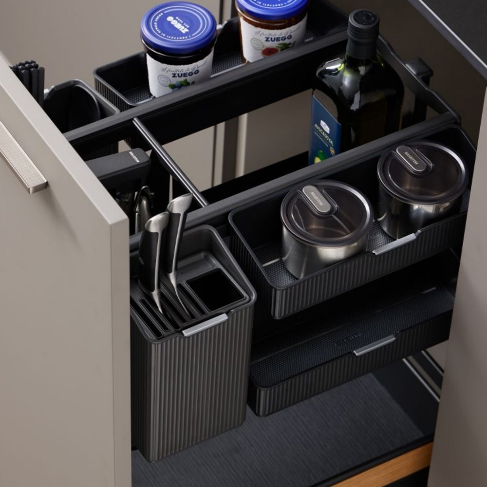 این سوپر زمینی با مکانیزم بالابری اختصاصی، امکان آویزان کردن ابزارهای بلند آشپزخانه را فراهم میکند و با حرکت نرم و آسان به سمت بالا و پایین، دسترسی سریع و راحت را تضمین میکند. طراحی مقاوم در برابر حرارت، خراش و رطوبت، دوام و تمیزکاری آسان را به همراه دارد و تحمل وزن تا ۴۰ کیلوگرم را دارد. ساختار دو طبقه این سوپر شامل طبقه پایینی با کف چوبی مقاوم برای وسایل بلند و طبقه بالایی با سطح ثابت و چند سبد نظمدهنده است. سبد مخصوص جای چاقو و ابزار آشپزی نیز به آسانی جدا میشود تا نظافت و جابجایی ساده باشد. این محصول به درب یونیت متصل میشود و با ریلهای آرامبند با کیفیت Hettich، باز و بسته شدن نرم و بدون لرزش را تضمین میکند.