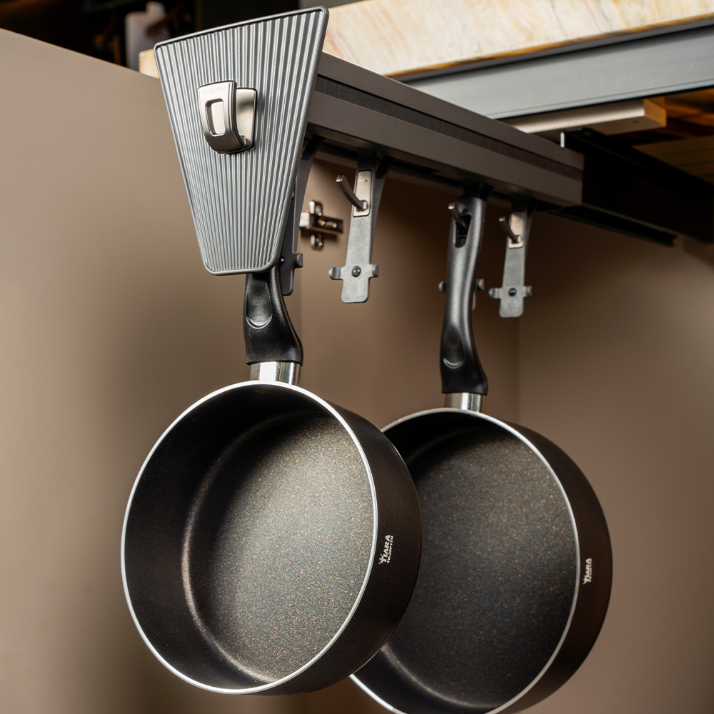 نگهداری ظروف دستهدار همیشه چالشبرانگیز بوده، بهخصوص وقتی کف ظروف روغنی و کثیف باشد که باعث آلودگی کابینت و سایر وسایل میشود. نظمدهنده جا تابهای این مشکل را با رویکردی خلاقانه حل کرده است. قلابهای شیبدار به گونهای طراحی شدهاند که تابهها به راحتی و با ثبات عمودی آویزان شوند و از برخورد و آسیب به ظروف مجاور جلوگیری کنند. این سیستم انعطافپذیر، با امکان جابهجایی واحدها، قابلیت تطبیق با دستههای مختلف قابلمه و تابه را دارد و به شما امکان میدهد هر طور که میخواهید فضای داخل کابینت را سازماندهی کنید