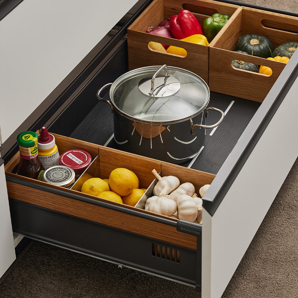 کشوی کف نسوز Schiers با طراحی پیشگامانه، کف خود را به نوارهای فلزی استیل ضد زنگ مزین کرده که در برابر حرارت بالا و خراش مقاوم است و ظاهری لوکس و مقاوم ایجاد میکند. این کف با ویژگیهای ضد لغزش و ضد جابجایی، به حفظ ثبات و ایمنی اقلام داخل کشو کمک میکند. جنس صفحه زیرین این کشو همچنین ضد آب است که تمیز کردن آن را بسیار آسان میکند. بدنه کشو از چوب محکم و نفیس با طراحی کلاسیک ساخته شده و به شبکههای تهویه مجهز است که امکان جریان هوا را فراهم میکند و از رطوبت و بو جلوگیری میکند. ریلهای بدنهدار Hettich آلمان که با کیفیت عالی و دوام بالا شناخته میشوند، تجربهای روان و بینقص در باز و بسته شدن کشوها فراهم میآورند. این کشو میتواند تا ۴۰ کیلوگرم وزن را تحمل کند، که نشاندهنده استحکام و دوام آن است.